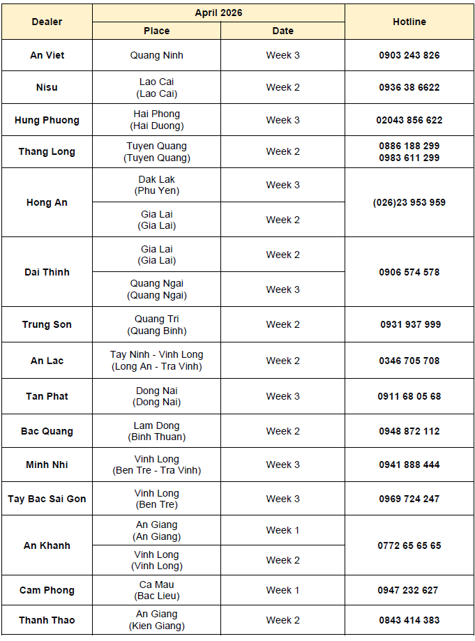 MOBILE SERVICE SCHEDULE AT ISUZU DEALER NETWORK IN APRIL 2026