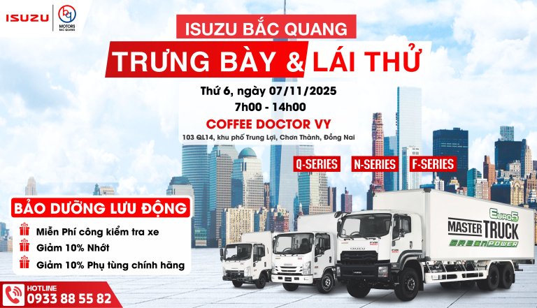 LÁI THỬ XE – NHẬN NGAY QUÀ TẶNG Isuzu Bắc Quang trân trọng kính mời quý khách hàng đến tham gia dự chương trình lái thử xe tại: Địa điểm: COFFEE DOCTOR VY 103 QL14, khu phố Trung Lợi, Chơn Thành, Đồng Nai Thời gian: 7h ngày 07/11/2025 Khi tham dự sự kiện, Quý khách sẽ được trải nghiệm các hoạt động thú vị như: Lái thử các dòng xe Isuzu Được tư vấn các thông tin về dịch vụ bảo hành, gói hỗ trợ tài chính cùng các khuyến mãi tại từng thời điểm. Thưởng thức miễn phí nước…